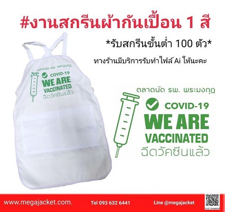 ผ้ากันเปื้อนแม่ค้าสกรีนตลาดนัดพระมงกุฎ หมวกแม่ค้า หมวกโรงงานพร้อมสกรีนโลโก้ 093-632-6441